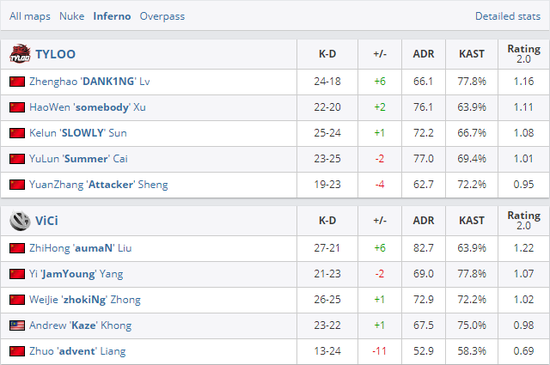 在第24局中4V1的残局中,更是出现了B区Slowly和白菜补枪不利被逐个击破、Attacker和小鬼身揣经济不买钳子的情况,被Kaze灵性决策完成了这个超高难度残局。幸得石家庄狠人DANK1NG在关键局个人能力有所爆发,而后的局数中VG也操之过急才让对手将分差拉近。最致命的是,第29局VG成功突破包点后警家烟却出现了失误导致被翻,第30局TYLOO更是有如神助一般四A防守赌中了对手的进攻成功将比赛追入加时。在加时赛中,还是TYLOO技高一筹惊险赢下了比赛。