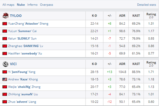 在首图Nuke上,虽然可以看出TYLOO针对这张地图花费了不少功夫,但细节上的瑕疵还是给了经验老道的VG很多机会,幸得半场后半阶段双狙防守体系建立TYLOO才得以将分差拉进。转守为攻后,TYLOO的进攻就不如防守那般如意,搜点不细补枪脱节以及优势残局无法稳住等原因都让双方分差再度扩大。最终,VG凭借年轻人JamYoung以及zhokiNg的关键发挥顺利拿下首图的胜利。