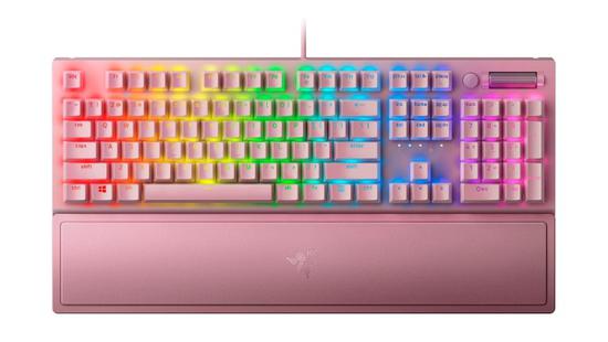 此外,BlackWidow黑寡妇蜘蛛V3也提供了颇为流行的粉晶款,与新近推出的毒蝰终极版共同成为Razer粉晶外设套装的一部分,为那些喜爱更多色彩游戏装备的玩家提供了选择。