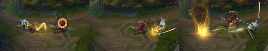 在这样的前提下,我们还是有许多空间可以去发挥创意的。对于亚索来说,他的视觉特点是长发、腰上的剑鞘以及肩甲,我们首先会保留这些要素。同时,亚索的定位是灵动、飘逸的「疾风剑豪」、在游戏对战中也常常是玩家眼中的焦点,所以在这款新皮肤的设计中,我们一直觉得闪亮的金色是最适合他技能和定位的颜色。