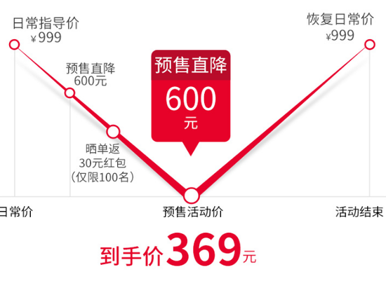 本次首发采取预售+现货模式,预售直降600元,到手价只需369元,如此力度,手慢无哦!