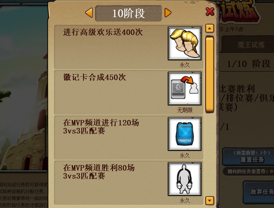 普通试炼规则:玩家点击“开启试炼”可接受到系统随机分派的任务。完成任务,点击活动面板“完成任务”即可获得活动奖励。若放弃当前任务,需等待6小时后,才可以再次挑战当前轮数任务。(重新挑战系统将再次随机分派任务)本次活动1-10阶段普通试炼不再有倒计时限制,玩家们可以更安心的完成任务。普通试炼将分阶段开启。