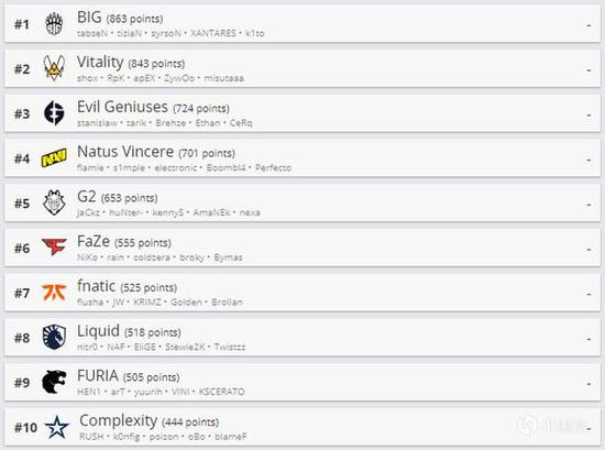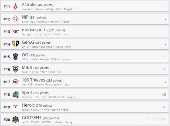 HLTV每周积分榜更新,休赛期各队积分变化不大,名单上半部分较为稳定,OG重回前15名。