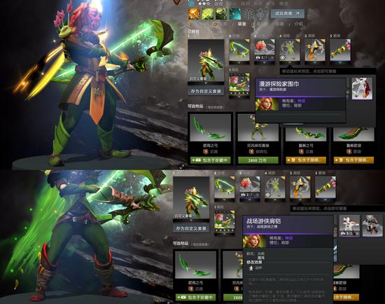 说实话剑圣笔者不怎么想讲,因为饰品太多了实在是萝卜青菜各有所爱。笔者自己用的是金不朽刀,解锁至宝,TI5裙子辨识度高,TI10手臂背部比较帅。有人喜欢曲折荣耀,但那套硬生生矮了半个头实在不敢恭维。曲折荣耀的绿色发光组件配合至宝款式一真的还不错,爱是一道光绿得人发慌。