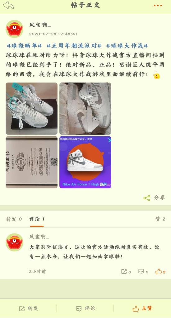 除了火爆的直播抽奖,游戏内大型球鞋免费派送活动也已经上线,快来看看已经拿到球鞋的球宝们的晒单吧!看直播、玩游戏,规则简单门槛低,这么豪横的福利活动,你确定不来参与下么?