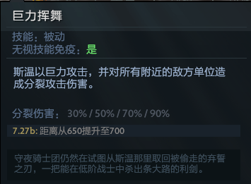 如果说技能可以量化为金钱的话,巨力挥舞本身至少价值4000块,满级90%的分裂伤害是斯温可以高效发育的基础(无视技能免疫)。巨力挥舞高达700的伤害范围,也是斯温遇神杀神,佛挡杀佛,砍翻所有敌人的关键技能,不过巨力挥舞的分裂伤害需要计算护甲。另外值得注意的是,前期如果主升巨力挥舞,兵线控制的难度非常高,需要自身做好己方小兵的反补并沟通队友积极拉野。