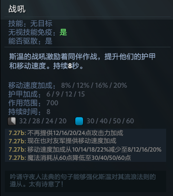 战吼是一个斯温保护己方脆皮非常实用的技能,满级可以为队友提供15点护甲加成与20%的移速加成,相当好用(铁血真男人的柔情一面)。无论是团战、逃跑、还是推进时都可以开一下,提示一下,斯温的战吼仅对英雄级单位及幻象生效,战吼可谓天生的剑圣无敌斩及减甲流的克星,并且在当前版本的鞋类物品重新跳回固定数值的情况下,群体移速的增益加成的重要性不言而喻。