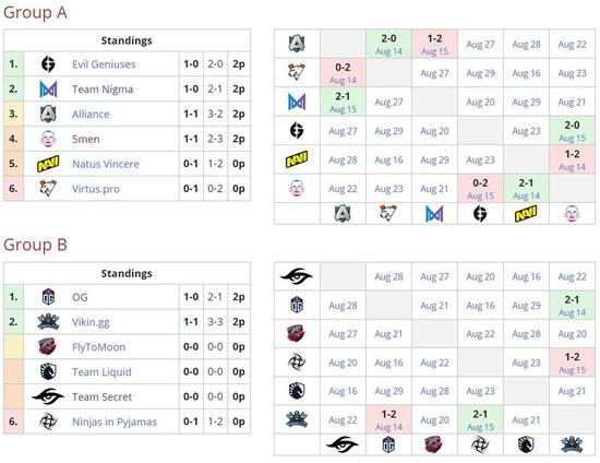 目前A组排名第一的队伍为EG,他们在BO3里没有丢掉一个小局,而B组这边第一名的依然是OG,只不过Secret还没有发力,不知道OG第一的势头能够保持多久。
