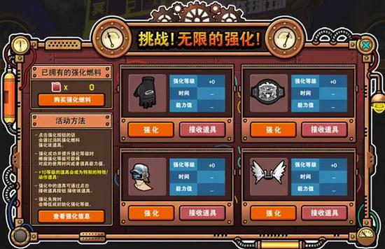 玩家点击强化按钮,会通过消耗燃料强化该道具,不同强化等级消耗染料不同。强化成功提升强化等级时,根据强化等级可以获得对应的使用时间或者道具能力值。+10等级的道具会变为特效/动作道具。