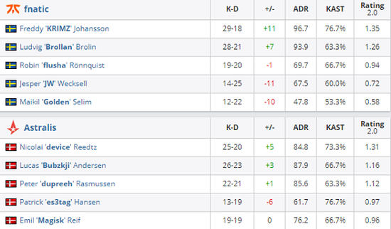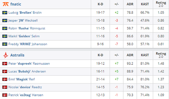 先做进攻方的A队简单的干拉外场拿下手枪局之后有惊无险的取得了3-0的优势,但是随着fnatic一波耐心的B点回防让双方再次回到同一起跑线,可是稳住局势之后还是A队的协同打得更好,两位队内元老Magisk和dupreeh的状态正佳带领队伍半场10-5领先。顶住了fnatic的手枪局快攻后Astralis已经确立了胜势,稳健的他们没有给fnatic任何机会,直接16-5带走比赛拿下图一。