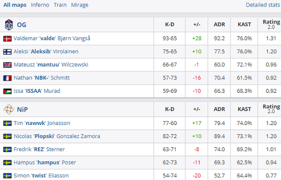 实力相近的两队在各自的首战便各自拿出令人恐怖能力与毅力,两队在首图互相打出半场好戏,在队内大哥的带领下双方比分持续焦灼,你来我往的长枪局让局势愈发紧张,OG在10-14严重不利的情况下在Valde的多杀下稳住局势并以19-16惊险取胜。图二的OG表现依然不错,除了拿下手枪局后被钢枪翻盘并产生的连锁反应,后半段的他们发挥让比分继续翻炒至8-7。不过下半场NIP拿下至关重要的手枪局后局势便向NIP倾斜,经济越大越好的NIP在nawwk狙击的发挥以及P元帅6道的多杀下NIP以16-12成功扳回一城。