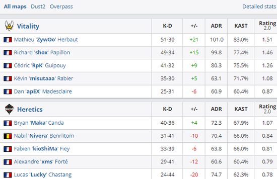 Vitality 2-0 Heretics(Dust2 16-13;Overpass 16-8)