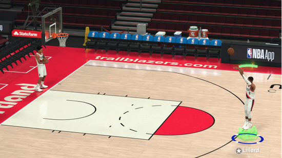 换言之,在使用专家摇杆投篮时,不需要抓时机了。若想精进技巧,也可以锁定出手时机:让专家摇杆保持在中间的位置来瞄准,或者在投篮动作达到最高点时轻按任意一个摇杆。锁定指示会在投篮条上一闪而过。若时机与准度都抓得很好,那命中的几率会非常高。
