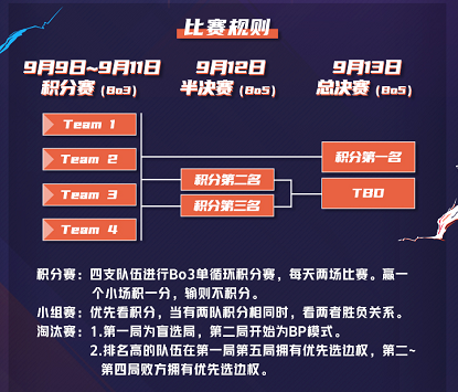 详细赛程如下:9月9日17:00虎牙卧龙队VS韩国雄鹰队,19:00虎牙凤雏队VS韩国猛虎队;9月10日17:00韩国雄鹰队VS韩国猛虎队,19:00虎牙卧龙队VS虎牙凤雏队;9月11日17:00虎牙凤雏队VS韩国雄鹰队,19:00虎牙卧龙队VS韩国猛虎队。9月12日与9月13日进行半决赛与总决赛。