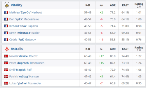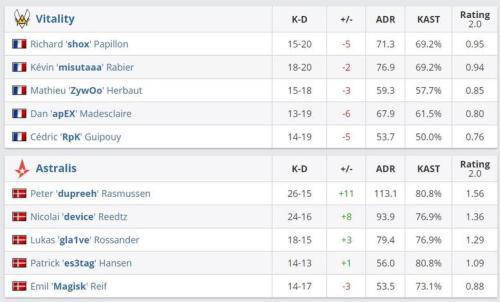 EPL欧洲区迎来Astralis和Vitality的强强对话。法国人在对方最熟练的Nuke上毫无反击办法;图二apEX重返18岁,连续几波镇守住A区拿下Vertigo;决胜图只有ZywOo和shox在发力的Vitality挡不住Astralis的轮番攻势。丹麦人拿到了自己小组赛的第二胜。