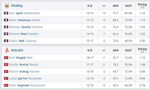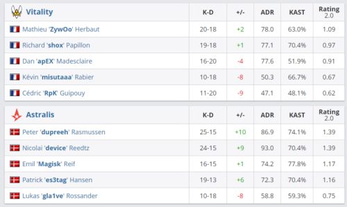 24局dupreeh接过狙击枪首杀破A,身后架好点位的dev1ce和Magisk没有再让ZywOo和shox的双狙创造奇迹拿到赛点。但apEX站在中路的烟雾弹边缘反制一波丹麦科技为队伍续上一分,Astralis也选择求稳存钱。本该是Vitality开始追风,却因A小的ZywOo致命空枪导致中路控制丢失,丹麦人集合一波B区,shox一人都没接住,16-11。