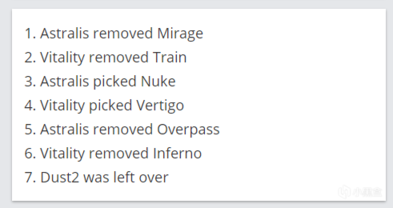 来到Vitlity选择的Vertigo。法国人丢下道具赢下手枪局A区进攻,并靠着shox的发挥连胜2分。长枪局Astralis的AB坡控制均已失败告终,又因gla1ve没有雷钳输掉3v2的残局。终于在第6局丹麦人靠着es3tag数次秒杀打赢B区回防,1-5。