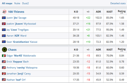 100 Thieves 2-0 Chaos(Nuke 16-3;Dust2 16-5)