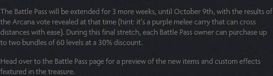 除了不朽三之外,V社还宣布将勇士令状延期3周至10曰9日,并将在勇士令状到期的时候宣布最终至宝获奖得主。V社还给出了提示:是一个紫色的近战Carry,可以轻松跨越一段距离——但显然这对幽鬼和虚空都适用,说了等于没说。在延期期间,所有令状拥有者能够购买2个60级的特惠包(7折)。