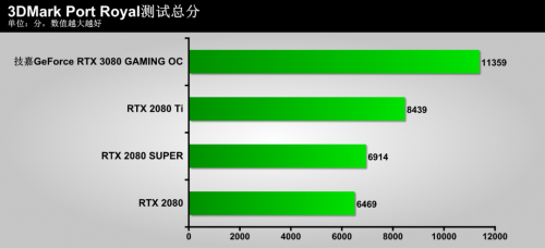 性能表现方面,在3DMark Port Royal测试中,技嘉RTX 3080显卡相较上一代旗舰GeForce RTX 2080Ti有近30%的提升,同时售价从GeForce RTX 2080Ti的9999元起回到5499元起,现在正是更新换代的最好时机。