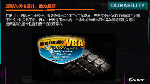 技嘉首发的两款显卡使用了超过公版的13相核心供电+4相显存供电,能为GPU核心及显存提供更稳定性能表现,同时每个MOSFET都有提供过温保护设计和负载平衡,有效的降低MOSFET工作温度,再加上技嘉Ultra Durable认证的全固态电容、超合金电感与超低电阻式晶体管等豪华用料,提供卓越的运算性能和更长的使用寿命。显卡背面有造型金属强化背板,不仅强化整体结构,防止电路板板弯或零件撞落,提供显卡多一层保护。