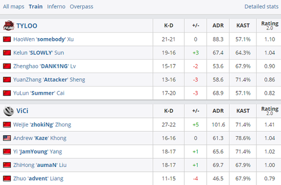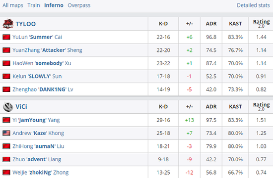 双方决胜图来到Overpass,TYLOO本局的开局依然进行出色,尽管在场面上不占优势,但关键时刻的残局TYLOO还是表现优异。但毕竟Overpass是一张不折不扣的CT图,自Kaze积攒经济起到狙击后,针对厕所中段VG投出大量精力与人力,效果也是极为显著。VG在0-5开局的情况下将比分反超至9-6。下半场拿下手枪局的VG本以为能够乘胜追击一波带走,只可惜钢枪翻盘的Somebody连续完成刷屏。两队随后又是熟悉的你一分我一分焦灼。第14-14分随后的关键局,Cy1与Danking在A区用枪法完成多杀成功突破,最终TYLOO以2-1的总比分2-1险胜VG。