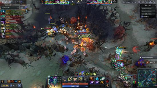 随后EHOME河道开雾VS先手换小强被一个壳弹晕三个,大屁股被TA玛尔斯集火秒杀,电魂抽攻抽蓝猫孽主临死之前给蓝猫套上莲花挡下抽攻,随后买活飞鞋反打将EHOME灭于三角区,VG逼高逼出EHOME四个买活。