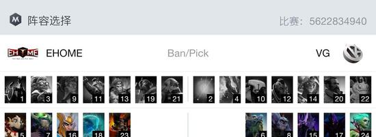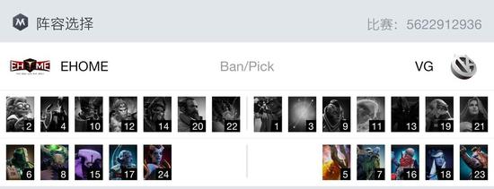 VG在天辉,EHOME在夜魇。选人阶段,前两手VG选出了巫医小强的双辅助,EHOME拿到凤凰玛尔斯双劣,三四手EHOME拿出VS和圣堂刺客,VG选出小狗和孽主,最后一手,VG选出蓝猫,EHOME拿到电魂。