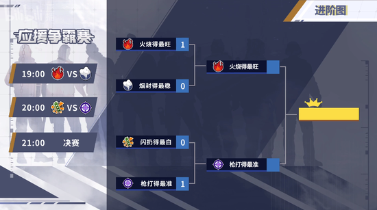 比赛共经过3场BO1的角逐,首场由橘子可率领的“烟封得最稳”队对战万四屋率领的“火烧得最旺”队,火队克服了队名上的“天生劣势”击败烟队,进入决赛。