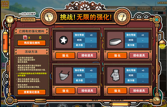 点击强化按钮,会通过消耗燃料强化该道具,不同强化等级消耗燃料不同。强化成功提升强化等级时,根据强化等级可以获得对应的使用时间或者道具能力值。强化中的道具可以通过点击“接收道具”按钮接收该道具。(等级0的道具无法接收)强化失败时会降低或者初始化强化等级。(初始化时即强化等级归0)接收后的道具在账号转送中选择能力值。+10等级的道具会变为特效/动作道具。