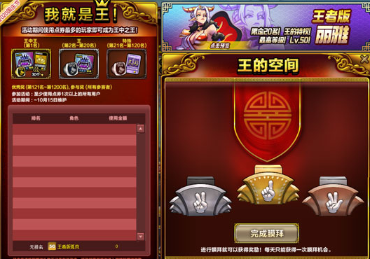 活动期间使用点券最多的玩家成为王中之王!活动期间使用点券至少1次以上。代金券消费不计算在本活动中。赠送礼物的消费不计入我是王活动。活动结束后,前二十名可获得王者限定角色:王者版丽雅。(活动结束后首次进入游戏发放)活动结束后,前三名可获得稀有道具:闪亮发型(黑白色,永久,无属性)该奖励在活动结束后三个工作日内发放。