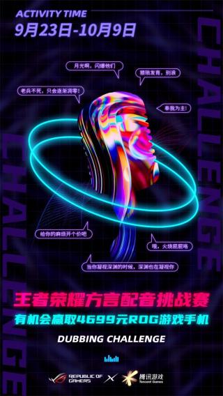 9月23日,腾讯游戏手机ROG官宣发起ROG王者荣耀方言配音挑战赛,“开启王者配音,释放荣耀大招。ROG手机助力国潮,守护传统,快选出你最爱的英雄,上传方言配音作品,让王者峡谷的英雄们说说俺们家乡话。”据悉,此次活动还邀请到了著名演员赵立新及王者荣耀官方配音老师共同担任赛事评委,以此呼吁更多人保护方言,为家乡话的传承全程打call。