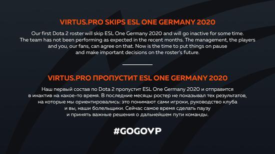 我们的一队阵容(VP主队)将退出ESL One德国站,并且全队转入不活跃状态。队伍在近几个月的表现并不如我们的预期,管理层、选手以及粉丝们都认同这一观点。现在是时候暂停一下,然后对未来的阵容做出重要的决定了。