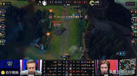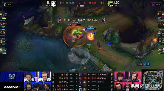 在开局对线方面,TL中下都占据主动权,第一波双方围绕河道蟹爆发团战,大木慎率先TP支援到位,5打4的情况下LGC只能撤退,tally加里奥被慎嘲讽留住,broxah男枪收获一血导致后续的中野对拼中男枪装备更好,打出相位猛冲交闪追击成功拿下babip千珏人头,又军训了加里奥一波,男枪3-0无解肥开局!