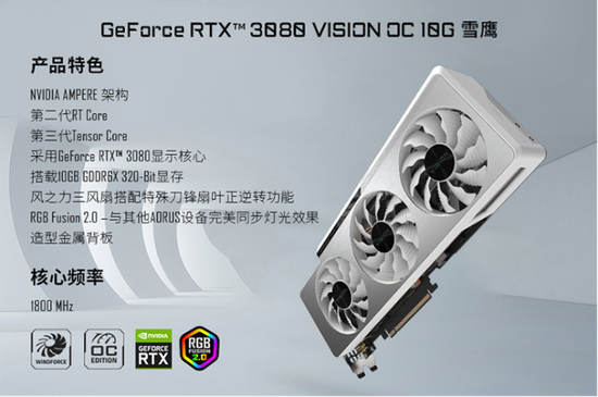 众所周知,显卡的主要消费人群除了游戏玩家,还包括大量的专业办公领域人群。他们对硬件的审美要求更高,更追求具有设计感和质感的产品。技嘉 RTX 3080 VISION OC-10GD 雪鹰正因此而生。