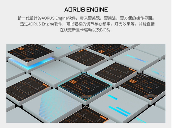 除了硬件设计亮眼,软件方面技嘉同样进行了创新。无论是AORUS超级雕RTX 3080还是RTX 3080雪雕都支持全新的AORUS ENGINE软件,可一键快速调节显卡以及其他技嘉设备的频率、灯效等设置,并支持在线更新显卡驱动和BIOS,方便普通玩家和设计师等硬件小白用户快速上手和应用,提升性能与工作效率。