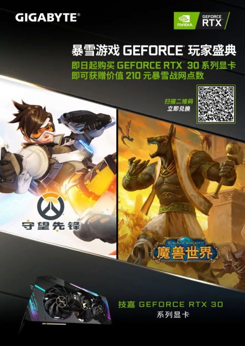 目前技嘉RTX 3080、RTX3090部分显卡系列已上市,现在购买还有机会参与暴雪游戏盛典活动(详见技嘉微信公众号):买显卡寄送价值210元的暴雪战网点数!技嘉RTX30显卡支持流畅运行4K乃至8K分辨下暴雪热门游戏,例如《守望先锋》、《魔兽世界》等,感受前所未有的震撼视觉享受,还等什么?赶紧行动起来吧!