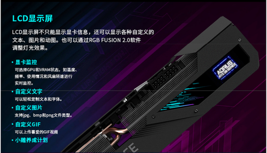最重要的还是外观方面:新一代的技嘉AORUS RTX 3080 超级雕颜值再次提升,不仅标配自带RGB的金属造型强化背板,还特别配备了一块支持1677万色彩的 LCD 显示屏,除了显示硬件信息外,还支持图片与文案自定义显示,个性化十足。支持整机RGB联动,通过 技嘉RGB FUSION 2.0就能轻松控制和实现整机的统一RGB协调,效果更上一层楼。