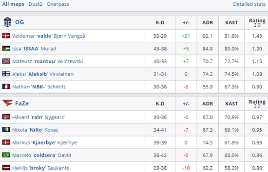 FaZe 0-2 OG(Dust2 12-16;Overpass 11-16)