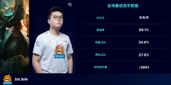 上路一波开团,SN打出一波团灭,携带大龙BUFF的SN直接大踏步走向敌方基地,无压力拿下比赛,再收一分。