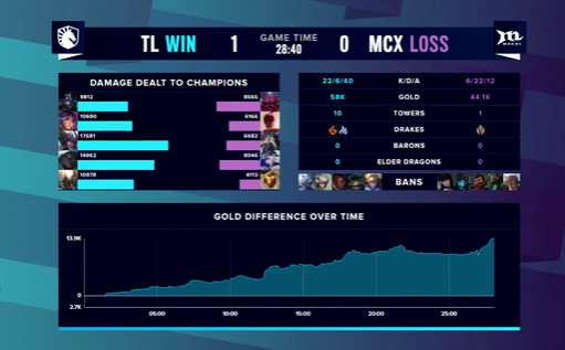 TL大龙梅开二度都被MCX成功阻止,随后盲僧在中路大招踢回辛德拉,MCX集火将其终结,但经济差距过大,TL一波一换四终结比赛,为自己保留了出线的希望。