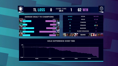由于视野的优势,G2得以轻松控下土龙。握有优势的G2选择大龙逼团,虽然狗熊先行送出一波人头,但由于双方经济和装备差距过大,卡莉丝塔输出不足,艾希直接砍下三杀,G2直接打出一波一换三团灭TL,蚕食敌方两路高地,经济领先超过一万。