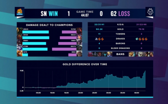 携带大龙BUFF的SN开始分线蚕食G2高地,中上两路纷纷告破,G2一波先手打出一波三换四,G2顺势拿下小龙。