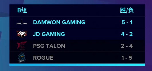 B组的淘汰赛开启,PSG找回状态连斩两胜却晋级无望,DWG不败金身被破依旧小组第一出线,JDG吃到水鬼一击无缘小组第一,RGE表现优异遗憾回家。