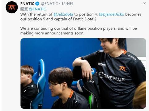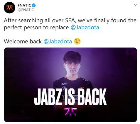 虽然Jabz再次重返了Fnatic,但是这次他将不再担任队长一职。他将担任队内的四号位,与DJ组成新的辅助双人组,而DJ则将成为队伍新的队长。队伍的3号位目前仍在空缺,近期他们也将公布更多信息。