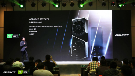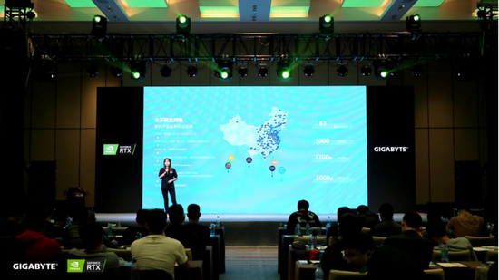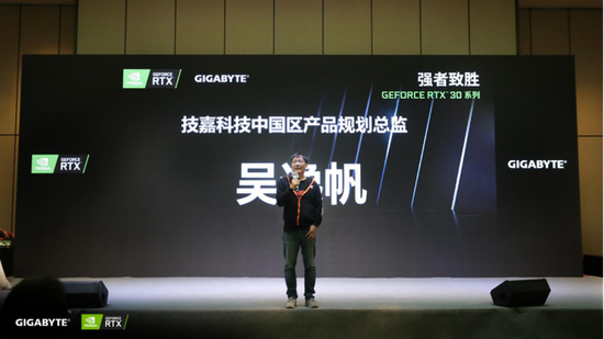 随后,技嘉科技中国区产品规划总监 吴逸帆先生进行致辞:英伟达在今年9月份发布了全新安培架构的 GeForce RTX™ 30系列显卡,同步技嘉科技也推出了独具特色的RTX™ 30系列显卡产品。该系列显卡基于NVIDIA Ampere架构的第二代RTX GPU,搭载全新RT Core、Tensor Core和流式多处理器可带来逼真的光线追踪效果和强大的AI性能,可以轻松的在更高的分辨率下提供更出色的视觉体验,甚至支持8K分辨率。GeForce RTX™ 3090、3080和3070代表了NVIDIA历史上令人惊叹的一代GPU飞跃。技嘉GeForce RTX™ 30系列显卡可为电竞场馆、游戏玩家和创作者带来震撼的性能表现!