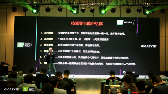 陈捷强调技嘉显卡能带给你:用料坚持——交网吧的虽然是工包,但和彩盒对应型号一模一样,绝不缩水偷料;品牌优势——10年来市占成长第一名,点名率、认可度明显提高;质保更久——包含风扇在内的三年质保,高端四年质保;维修高效——不仅返修率行业内最低,而且维修时效快;控单维护——不是谁都能报价的,我们有核心代理和SI,保证给到最有竞争力的价格;赛事合作——定期会有一些赛事合作落地到符合要求的网吧,有助联合品牌提升人气和热度等多种好处,是组建网吧、电竞及电竞酒店高端游戏电脑的绝佳选择。