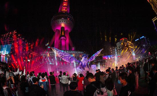 随着比赛进入白热化阶段,“上海城市峡谷生活月”城市文化活动也迈入高潮阶段。半决赛期间,在上海城市地标——浦东新区陆家嘴东方明珠塔脚下迎来了一场别开生面的“巨龙回巢”仪式,由中国国家级雕刻师雕塑的巨型实体远古巨龙迎来全球首秀。同时,来自不同地方数百名电竞爱好者相聚于此,在地面Mapping与灯光秀的表演中,见证了“巨龙回巢”仪式的开启盛况以及半决赛的精彩对决。