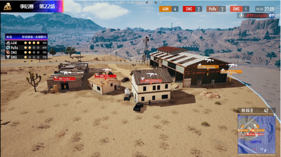 以季后赛第五天第四局比赛为例,此时五圈刷新,4AM所在房区处于圈外,但他们并没有着急进圈,而是在面前斜坡等待时机,当右边KX和QM激烈交锋时,他们果断出手成功劝架拿下安全区北部的所有领域,此时OMG和SMG在房区交战,果断占据房区大仓。此时GODV大胆选择两路同时推进,最终队员们也是不负众望,两边同时开花,最终将对手卡在房区,成功吃鸡!