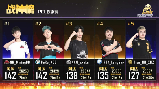秋季赛除了4AM的精彩发挥之外,NH战队的MmingDD展现了惊人的实力,整个秋季赛拿到142个淘汰,力压所有选手独占鳌头,来自PeRo战队的XDD排名第二,冠军战队选手xxxLu位列第三。NH战队凭借着MmingDD的出色发挥获得了秋季赛季军,成功进军PCS3东亚洲际赛!